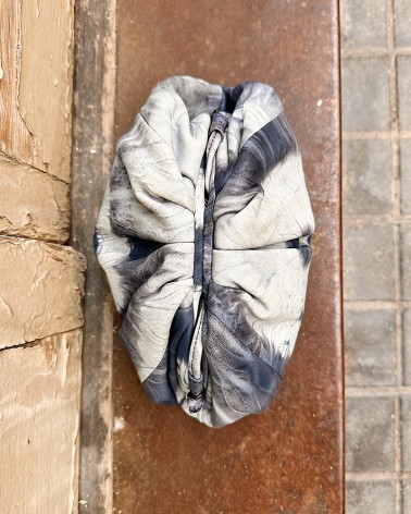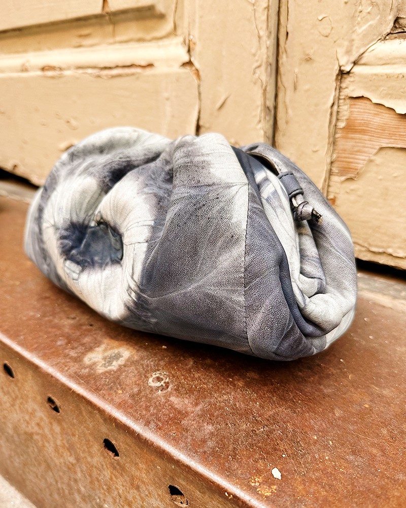 Bolsito cruasán confeccionado en suave piel estampado Tie Dye azul denim con bandolera larga escamoteable.