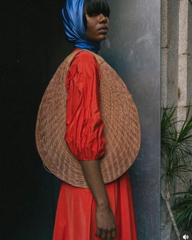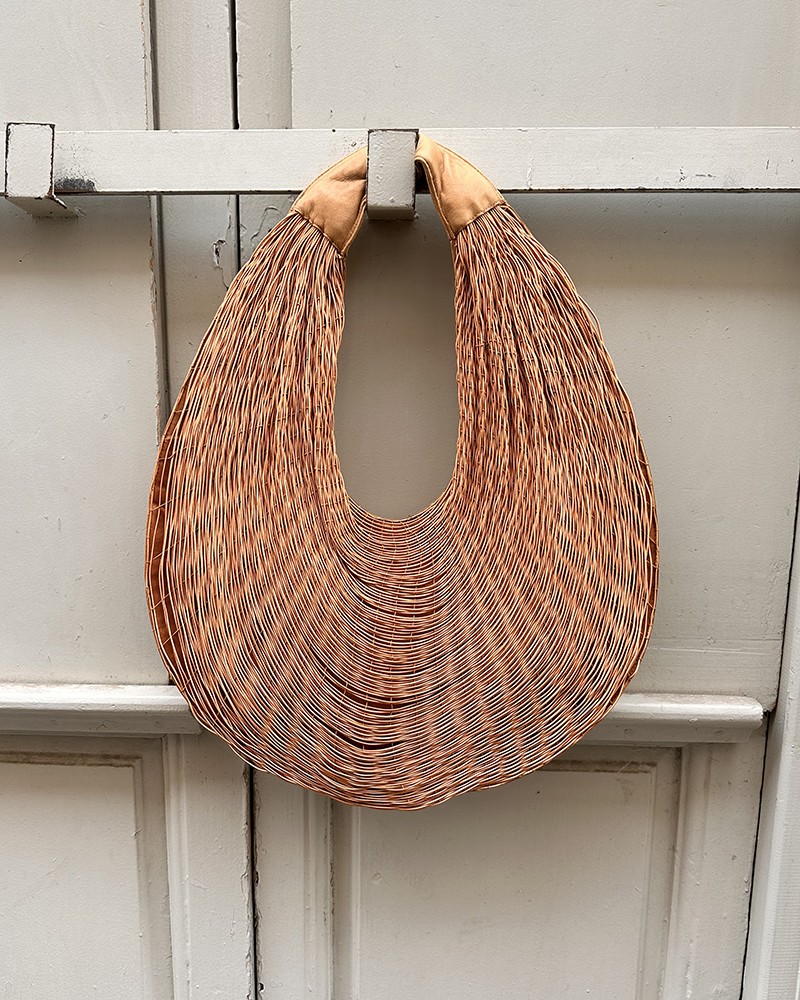 Exterior de red entrelazada con técnica única. La forma triangular del telar y la elasticidad de la fibra con la que se teje, dan lugar a la forma redondeada de la pieza.