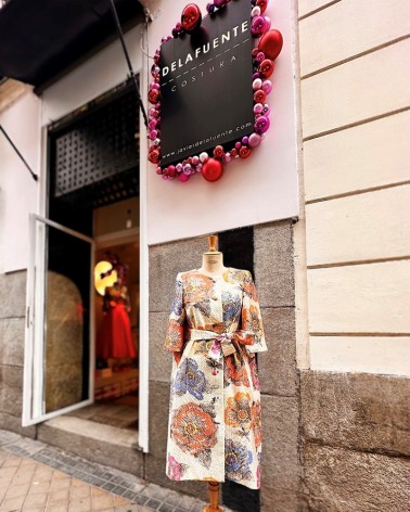 Impresionante vestido abrigo confeccionado en brocado de seda. Linea ajustada en delantero y espalda suelta evasé con bolsillos laterales.