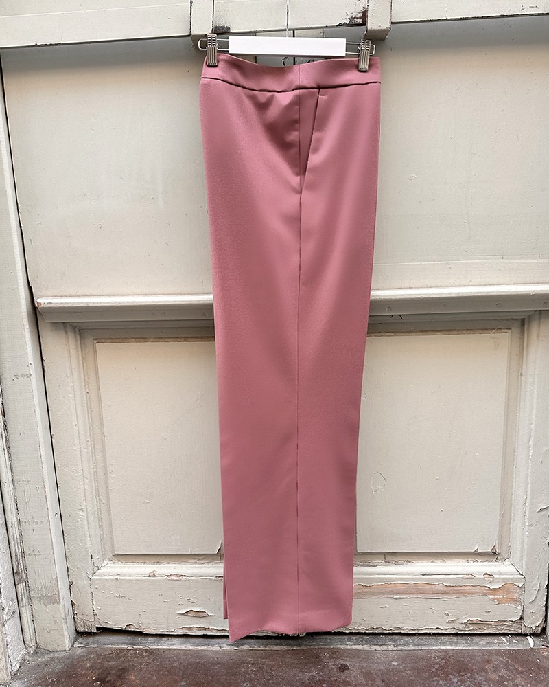 Espectacular pantalón recto con caida y raya marcada con pespunte nervio. Bolsillos y cremallera invisible en costados en color rosa titanic.