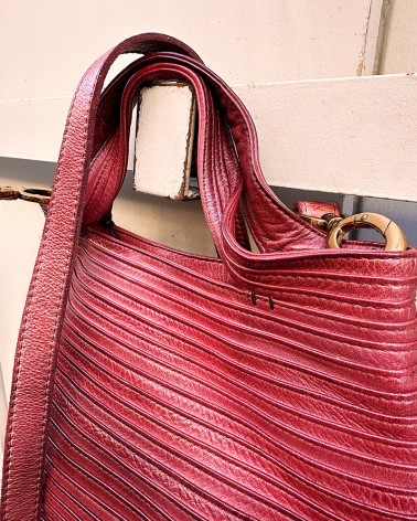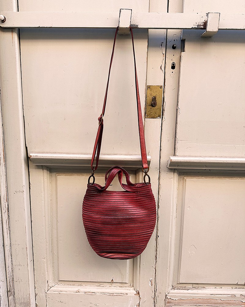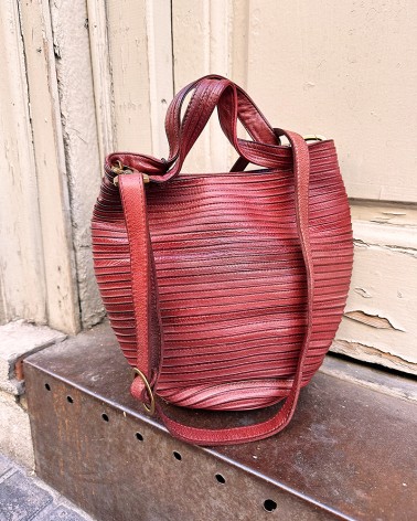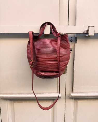 Bolsito cesta confeccionado en suave piel de la toscana con doble asa y correa larga. Interior diáfano. Realizado completamente a mano. Color rojo borgoña